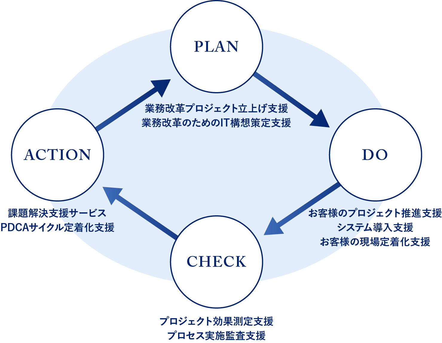 その視点から、当社では期待した成果を実現するための推進支援サービス提供にも重きを置き、業務プロセス改革プロジェクトやIT構想の「実行(Do)」「問題点の確認(Check)」「更なる改善( Action)」といった、成果を実現するためのフェーズそれぞれに対応したサービスを提供。それこそが、他のコンサルティング企業のサービスとの大きな違いです。
