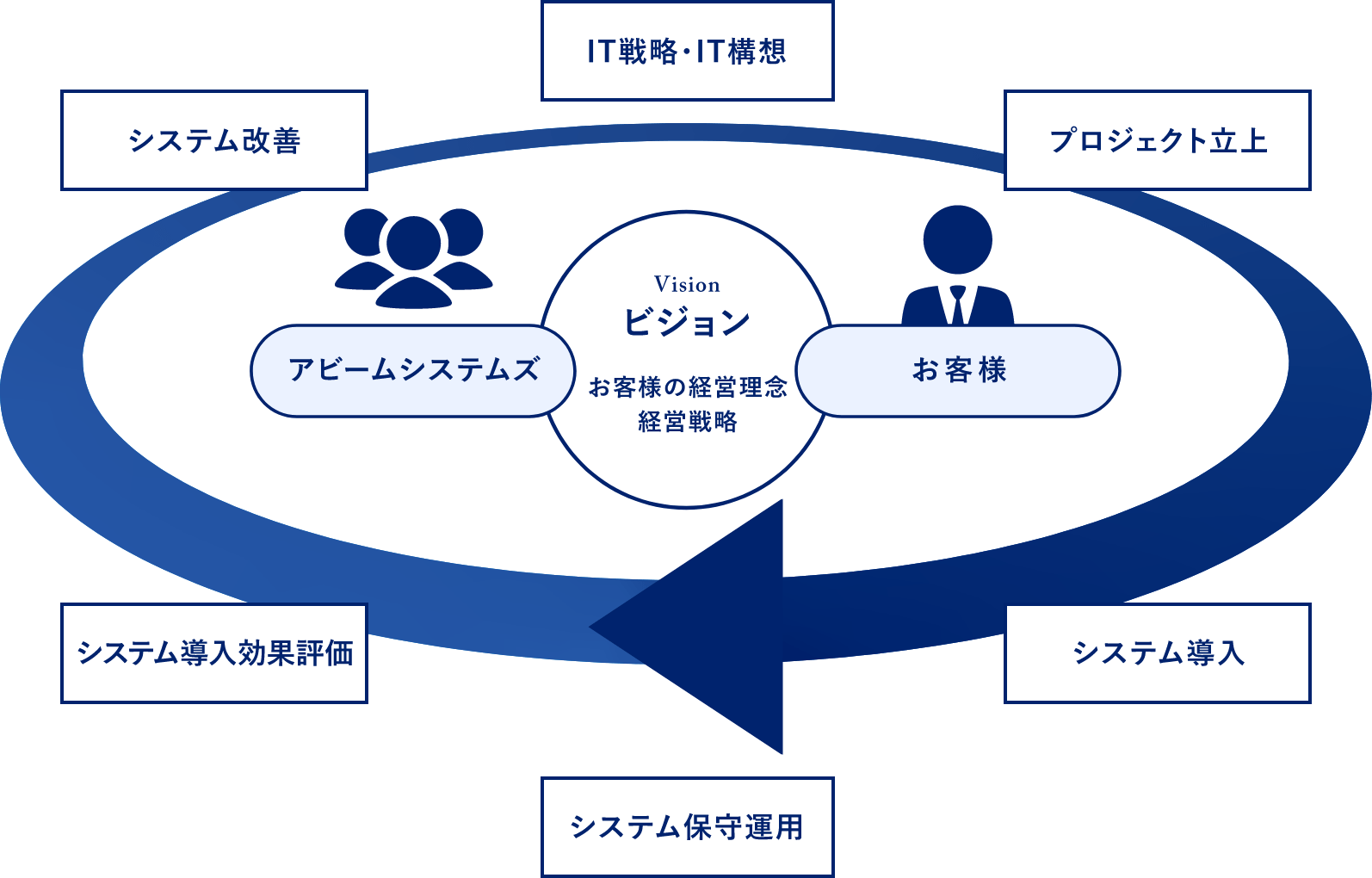 お客様の経営戦略や事業戦略のみならず、日常の中の実務の困りごとまでにも密接に結びついたIT支援を志し、それらを実現していくことによって、他社には模倣しがたい付加価値を提供し続けています。お客様の目標達成のためにはお客様の業務プロセスの改善・推進や、ときには共に痛みを伴う進言を行うことすらもあります。