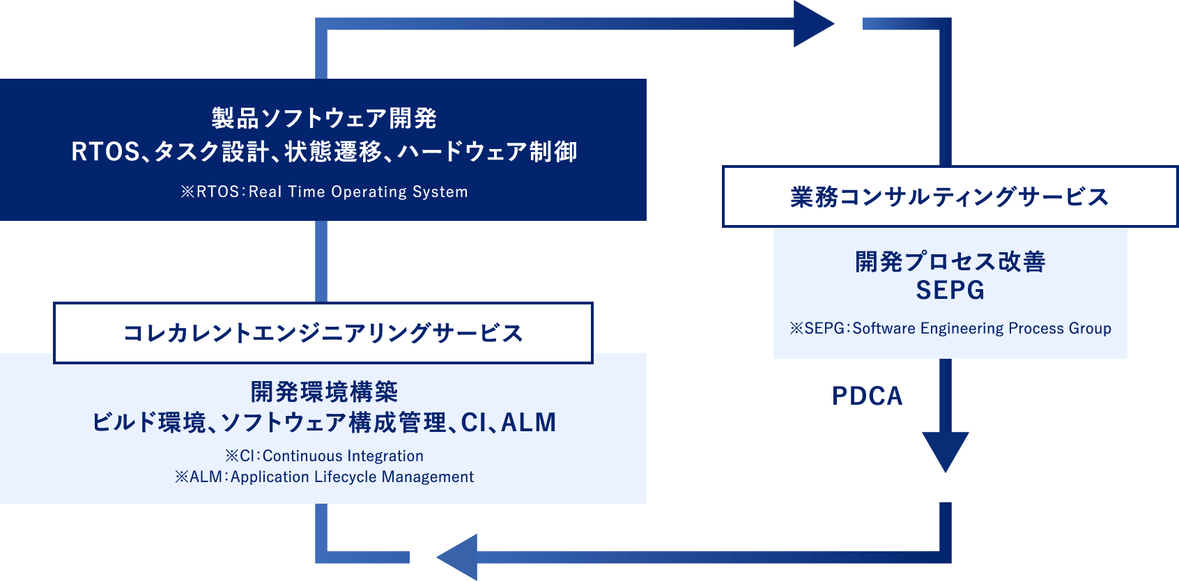 当社は、業務コンサルティング・コンカレントエンジニアリングを展開するチームと、組込ソフト開発サービスのチームが協調し、保持する開発ノウハウをいかしながら開発環境・開発プロセス改善サービスを提供するなど、開発部門に対する幅広いサービスの提供を目指して活動しています。
